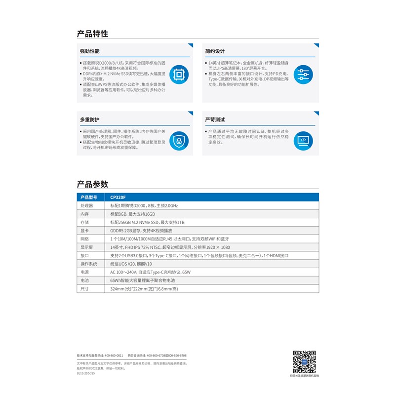 CPU:標(biāo)配1顆騰銳D2000 ,8核,主頻2.0GHz